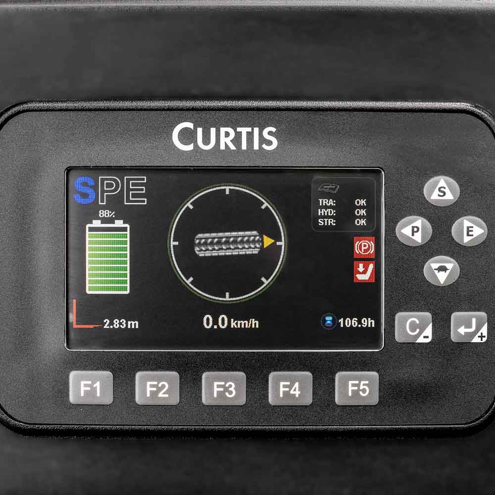The turning deceleration function provided for the standard configuration makes the turning deceleration of the stacker smoother and safer. For the standard configuration, an in-place switch is provided for the driver to judge whether he/she is in the correct operating position. When not in the correct position, driving and hydraulic operations are prohibited.