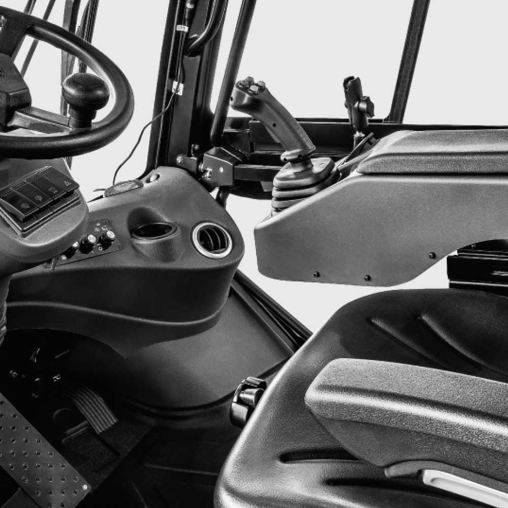 The compact integral joystick enables accurate remote control. The optimized hydraulic braking curve enables smooth easy-to-control braking. The suspended seat and ergonomically-movable multidirectional adjustable console enable comfortable control.